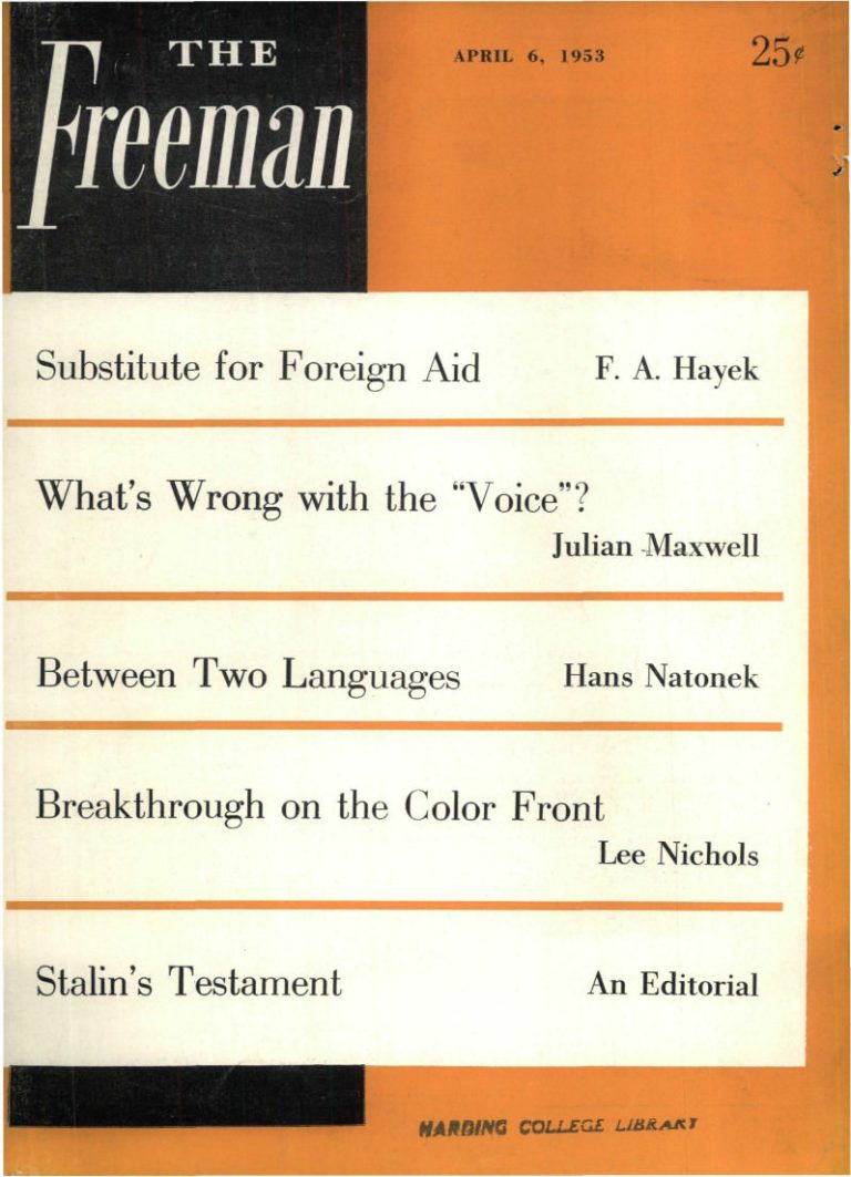 This issue of the Freeman explores a 1921 statement from Joseph Stalin, the Voice of America’s corruption and ineptitude, a Hayekian critique of foreign aid, and more.