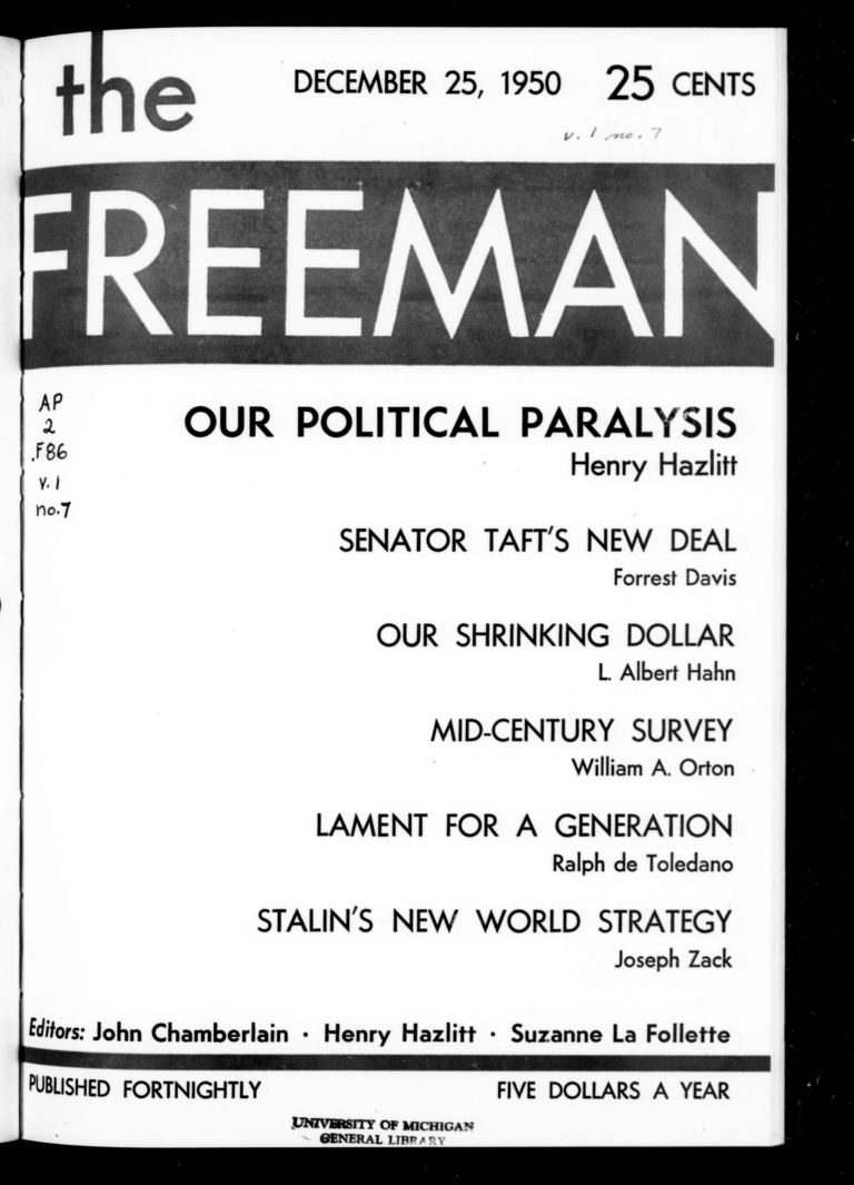 This issue of the Freeman explores America’s failed intervention in the Korean War, Senator Taft’s New Deal politics, Joseph Stalin’s “new world” strategy, and more.
