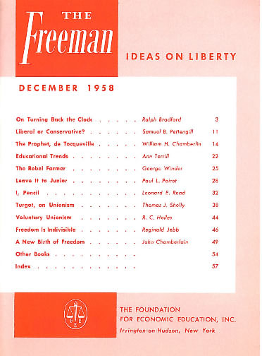 This issue of the Freeman explores the prophet de Tocqueville, “I, Pencil”, voluntary unionism, and more.