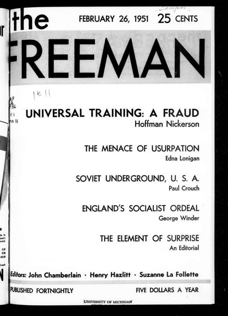 This issue of the Freeman explores universal military training, soviet sympathizers in the US, socialism in England, and more.