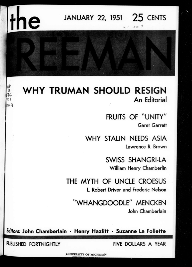 This issue of the Freeman explores arguments for President Harry S. Truman’s resignation, a critique on unity, an appreciation for Switzerland’s system of governance, and more.