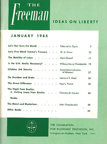 This issue of the Freeman explores why not to save the world, whether or not the UN is necessary, freedom and order, and more.