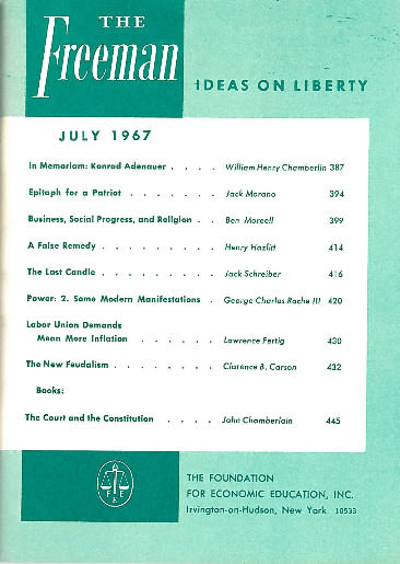 This issue of the Freeman observes the death of Konrad Adenauer — and offers articles on social progress, religion, labor unions, and inflation.