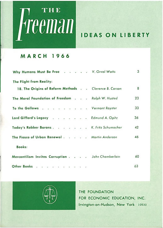 This issue of the Freeman explores why humans must be free, the moral foundation of freedom, today’s robber barons, and more.