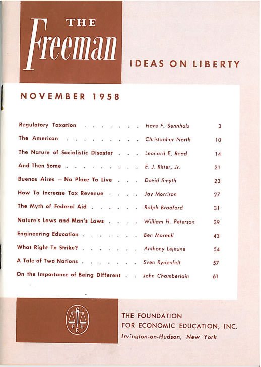 This issue of the Freeman explores regulatory taxation, socialistic disasters, the myth of federal aid, and more.
