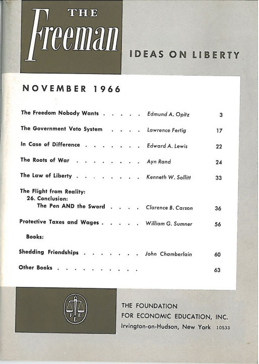 This issue of the Freeman explores the freedom nobody wants, the roots of war, the law of liberty, and more.