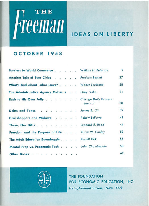 This issue of the Freeman explores barriers to world commerce, labor laws, freedom and life purpose, and more.