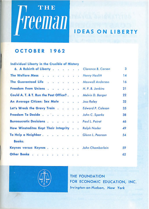 This issue of the Freeman explores the mess of social welfare, the freedom of decision, whether AT&T could run the post office, and more.