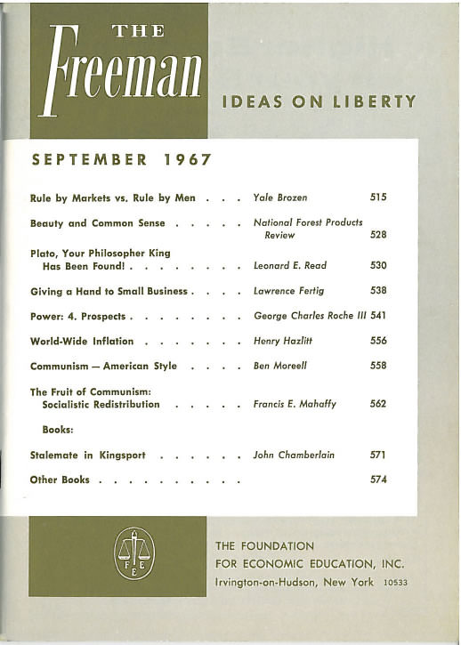 This issue of the Freeman explores rule by markets vs. rule by men, beauty and common sense, world-wide inflation, and more.